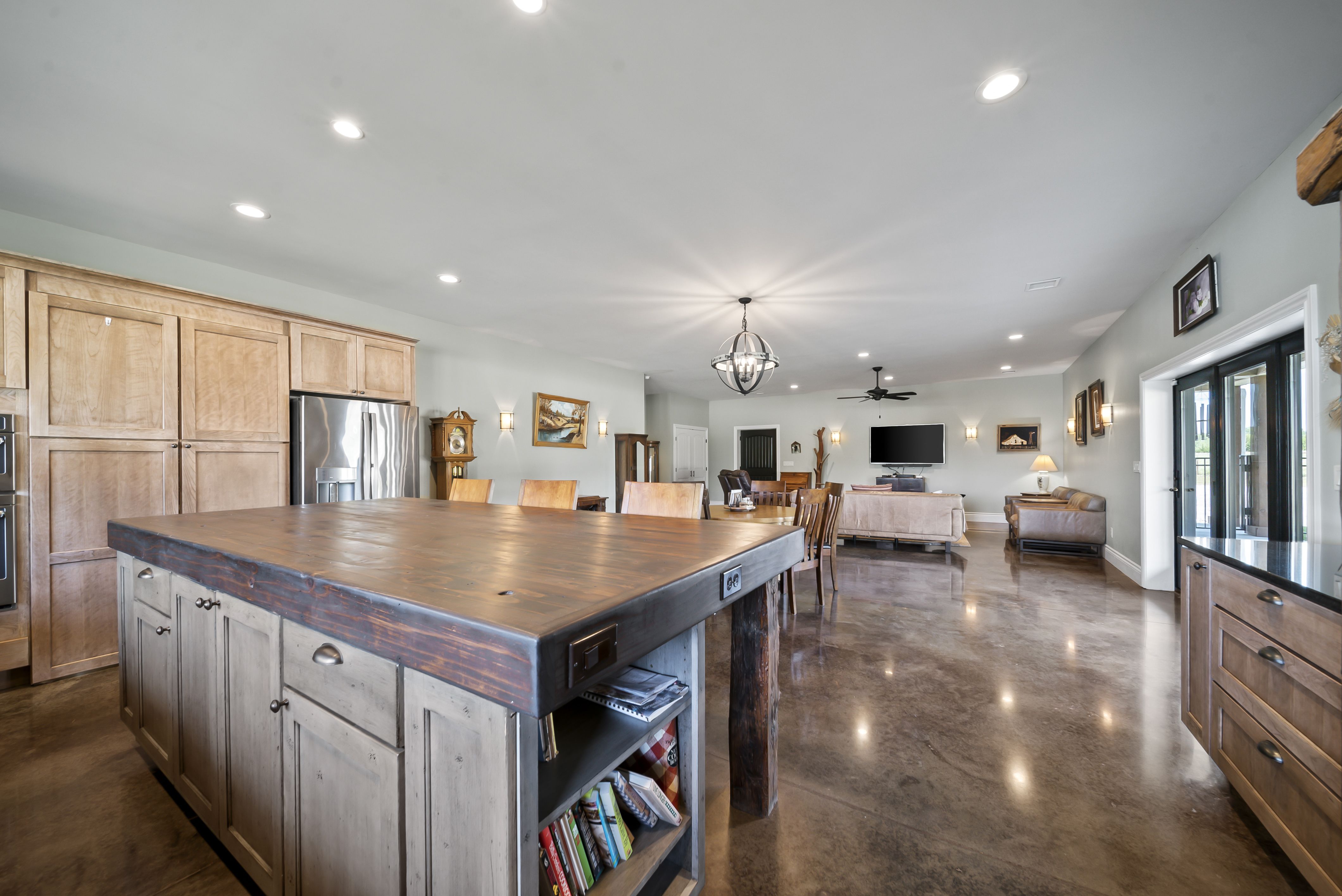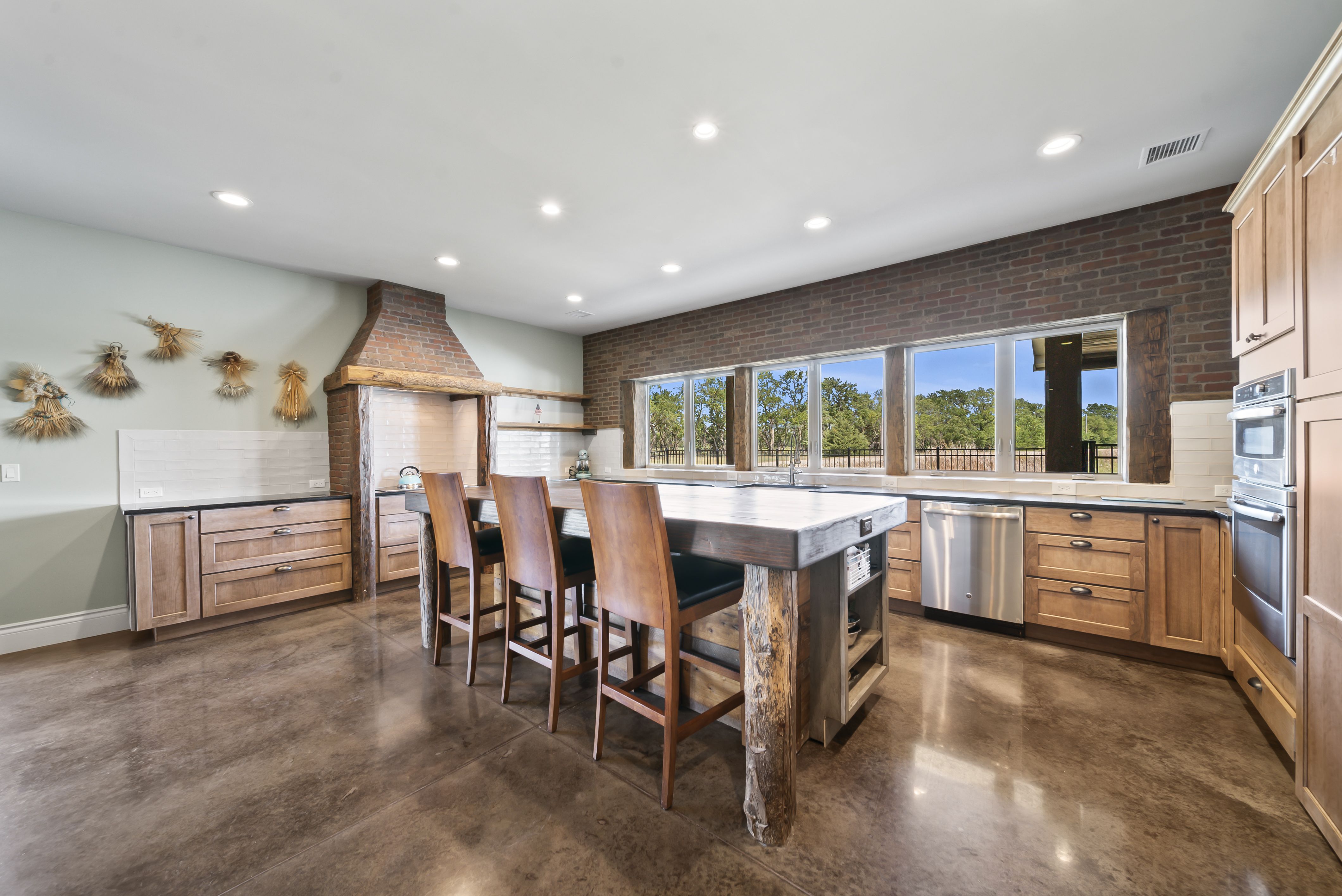 The Kitchen is a cook’s dream featuring a row of windows overlooking the large pond. Huge island bar, plenty of countertop space, farmhouse sink, convection oven, induction cooktop, and pull-out shelves any discerning chef would desire. Hidden kitchen cabinet doors access a huge pantry/laundry combo with plenty of shelf and storage space with an additional sink, as well a nice sized storm cellar.
