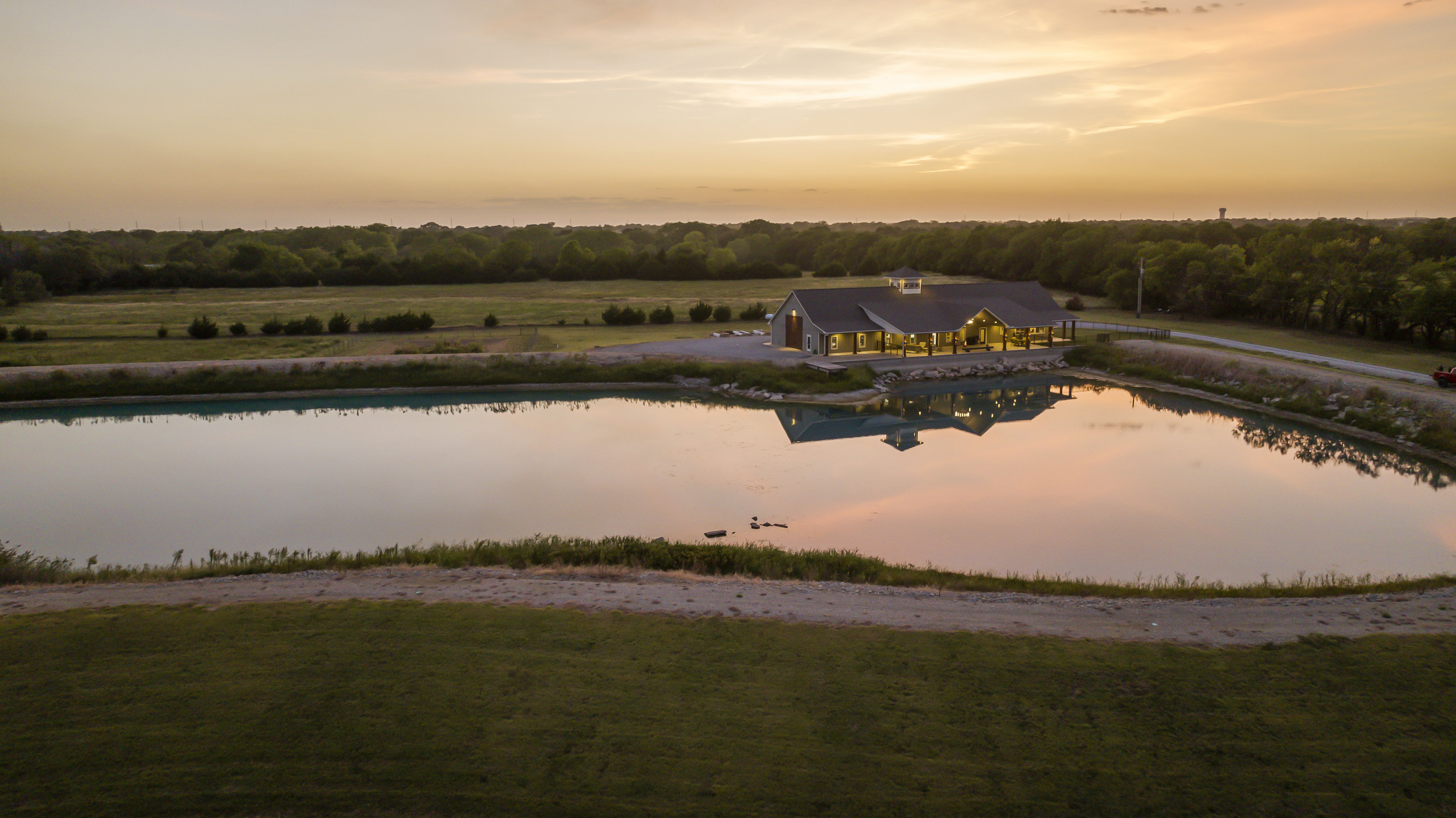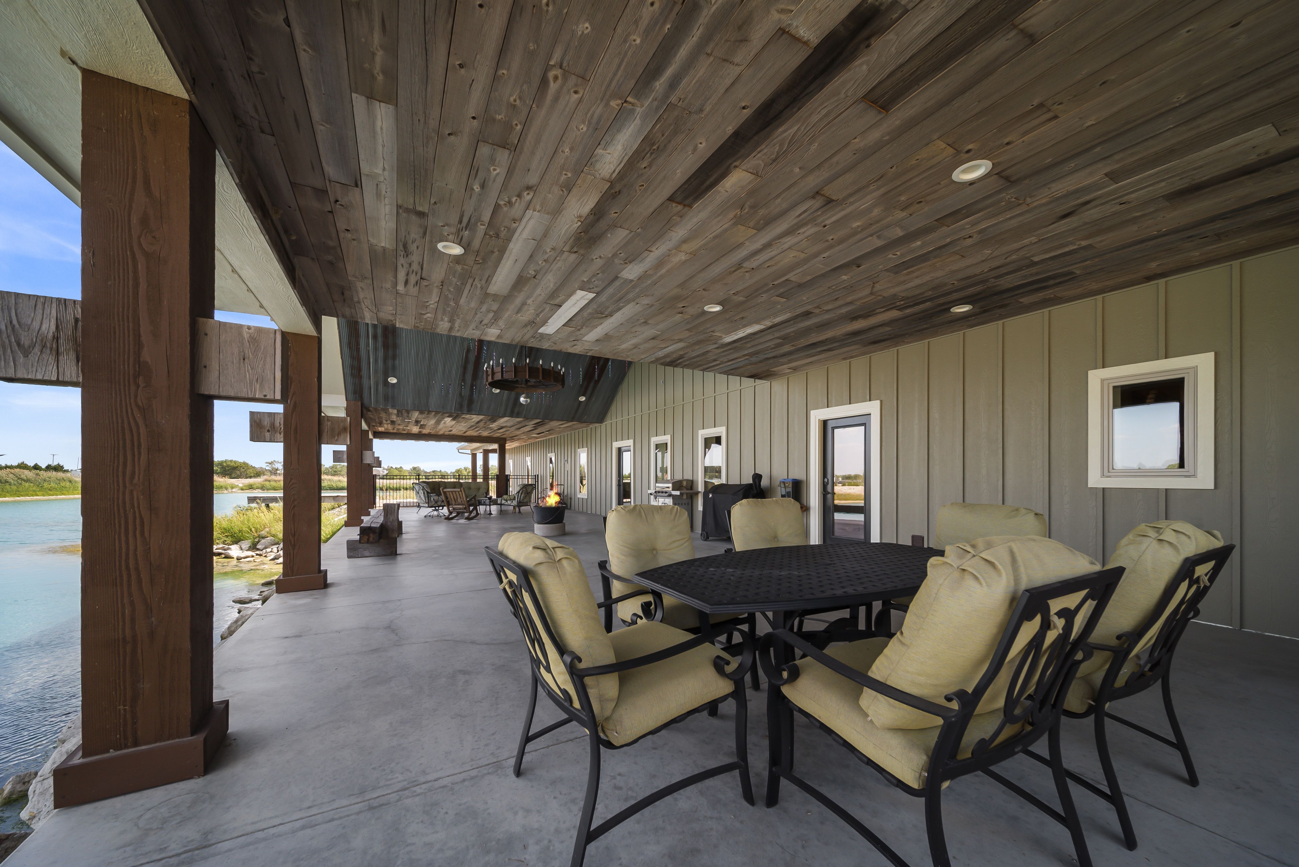 Expansive 75’ x 25’ covered patio is ideal for either entertaining or quiet introspection. Facing east for beautiful sunrises the huge patio is situated right on the water and overlooks the 3-acre pond stocked with bass, catfish, carp and bluegill, with its own dock.