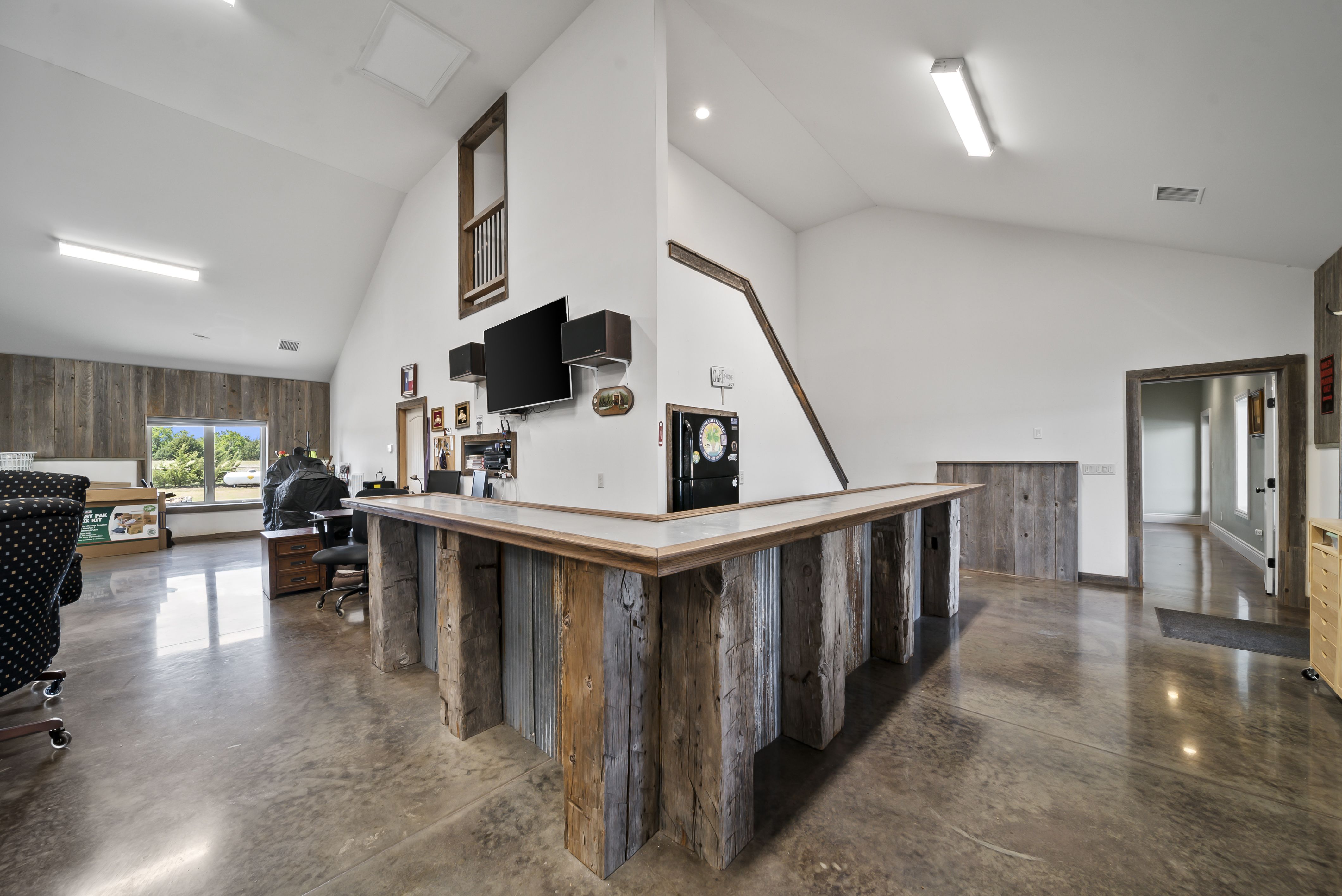 Huge finished attached garage with an additional 2785 sq ft of living space. This bonus room/garage offers 16’ ceilings, 14’ garage doors, and is large enough to park a 40’ RV with plenty of room to spare. Accommodating RVs, boats, golf carts, ATVs, and more. Additionally, the climate-controlled part of the home includes an L-shaped tin-topped dry bar, built in refrigerator, and additional bath making this a perfect "Man Cave". There is a 10x10 loft room that leads to the crow's nest with spectacular panoramic 360 degree window views for miles.